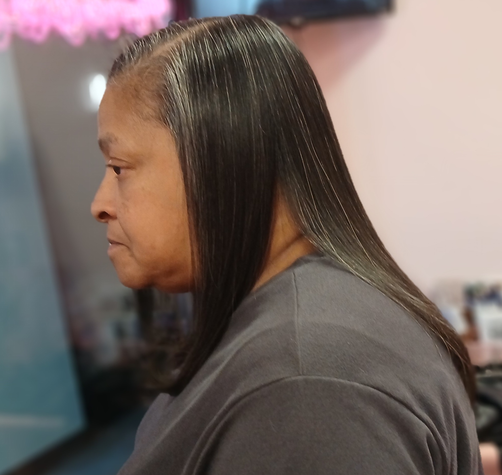 Achieve a silky, straight, and shiny look with a signature silk press service. Expertly applied heat and moisture-sealing techniques will leave your hair feeling luxurious and manageable. Heat protectant, hot style tools are used to achieve this Look.