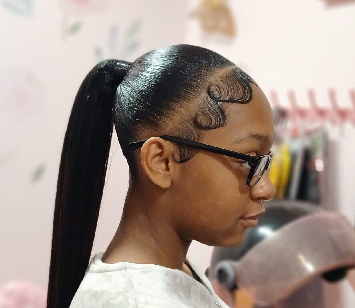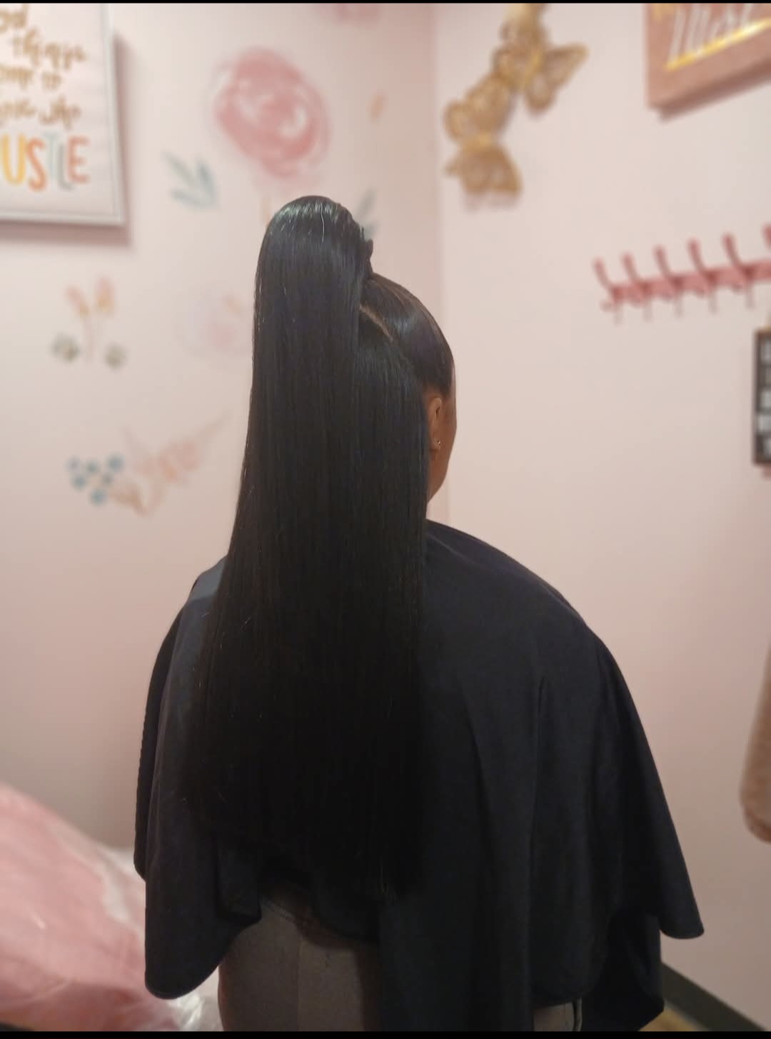 This polished style is Great for multiple occasions. Whether it be day-to-day, Business, Casual or an Extravagant event. Can’t go wrong with a Good Ponytail. Heat protectant sprays are applied to prevent damage. Hot styling tools are used to achieve this Look.