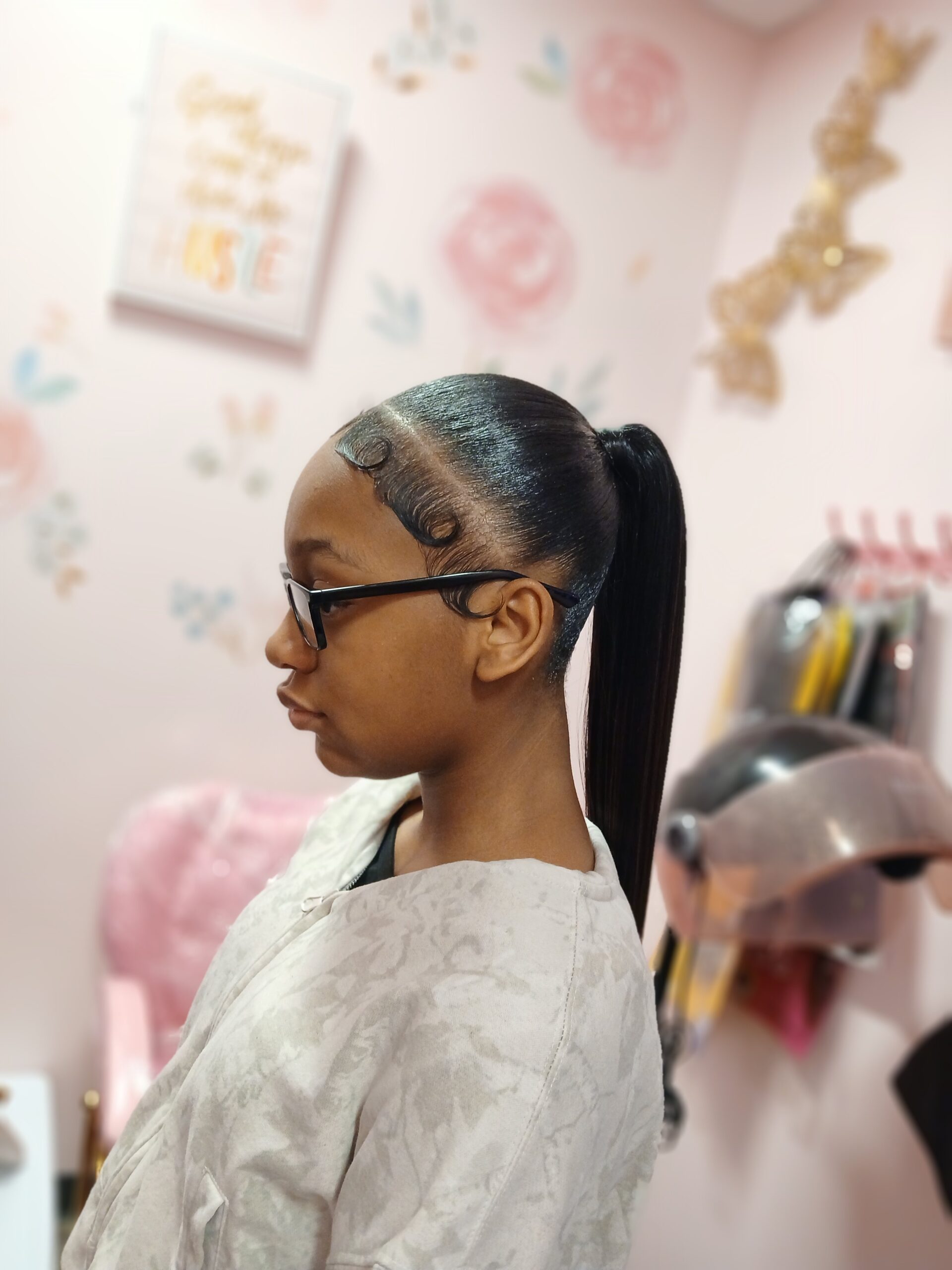 For added flair, at an additional fee Bangs, more than One Ponytail, a couple braids, Pinup/ updo ponytail style can be added.